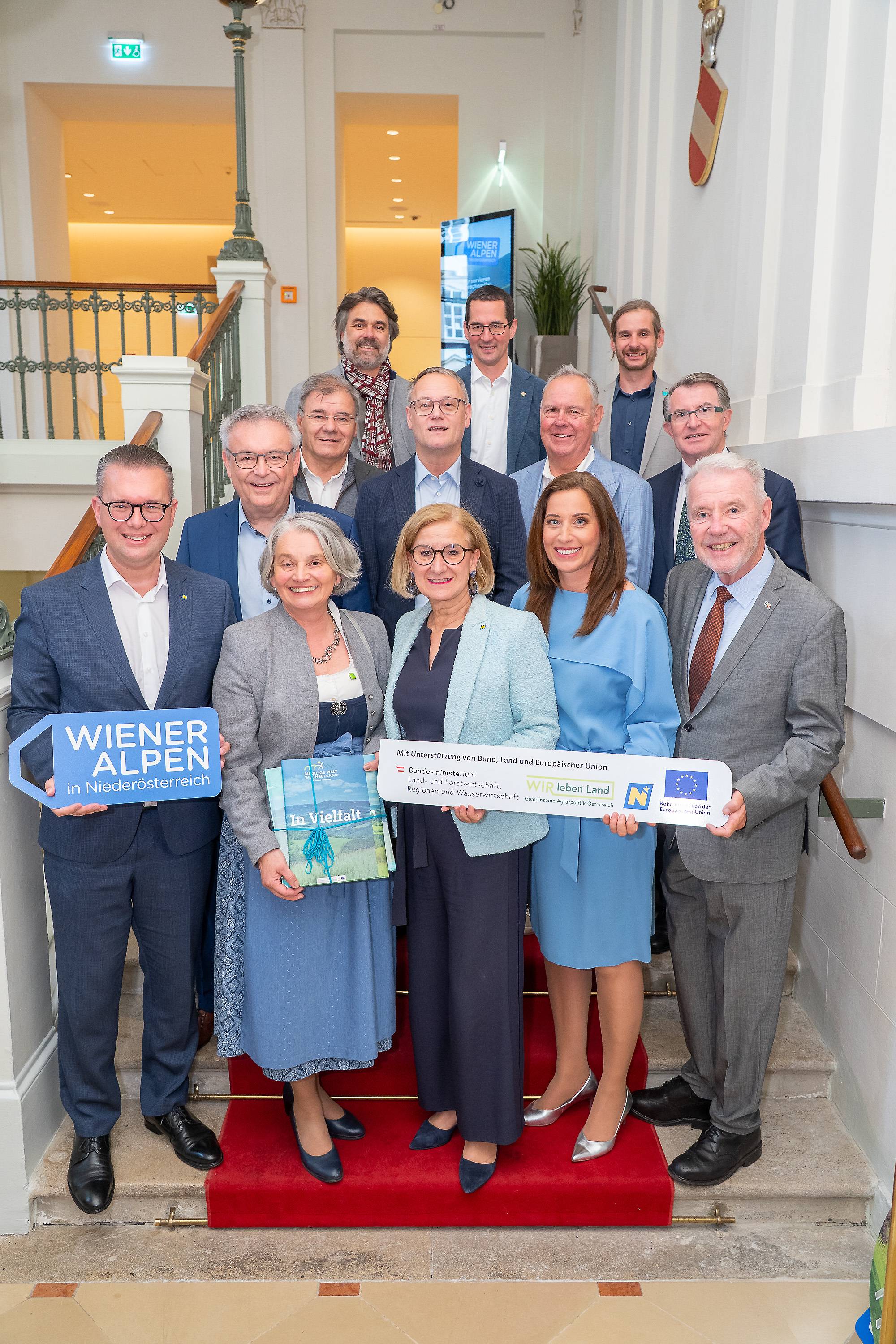 Pressebild 3: v.l.n.r./v.o.n.u. LEADER-Manager Martin Rohl (Niederösterreich Süd), Vizebürgermeister Stephan Ernst (Thermengemeinden), LEADER-Manager Florian Kerschbaumer (Bucklige Welt-Wechselland), Obmann Christian Blazek (Semmering-Rax), Obmann Bgm. Feri Schwarz (Bucklige Welt Süd), Obmann Bgm. Andreas Graf (Wechselland), Kulturstadtrat Franz Piribauer (Wiener Neustadt), Josef Laferl (Obmann LEADER-Region NÖ Süd), Bundesrat Matthias Zauner (Wiener Neustadt), Obfrau Bgm. Michaela Walla (Bucklige Welt-Wechselland), Landeshauptfrau Johanna Mikl-Leitner, Wiener Alpen Geschäftsführerin Mariella Klement-Kapeller, Bgm. Klaus Schneeberger (Wiener Neustadt)