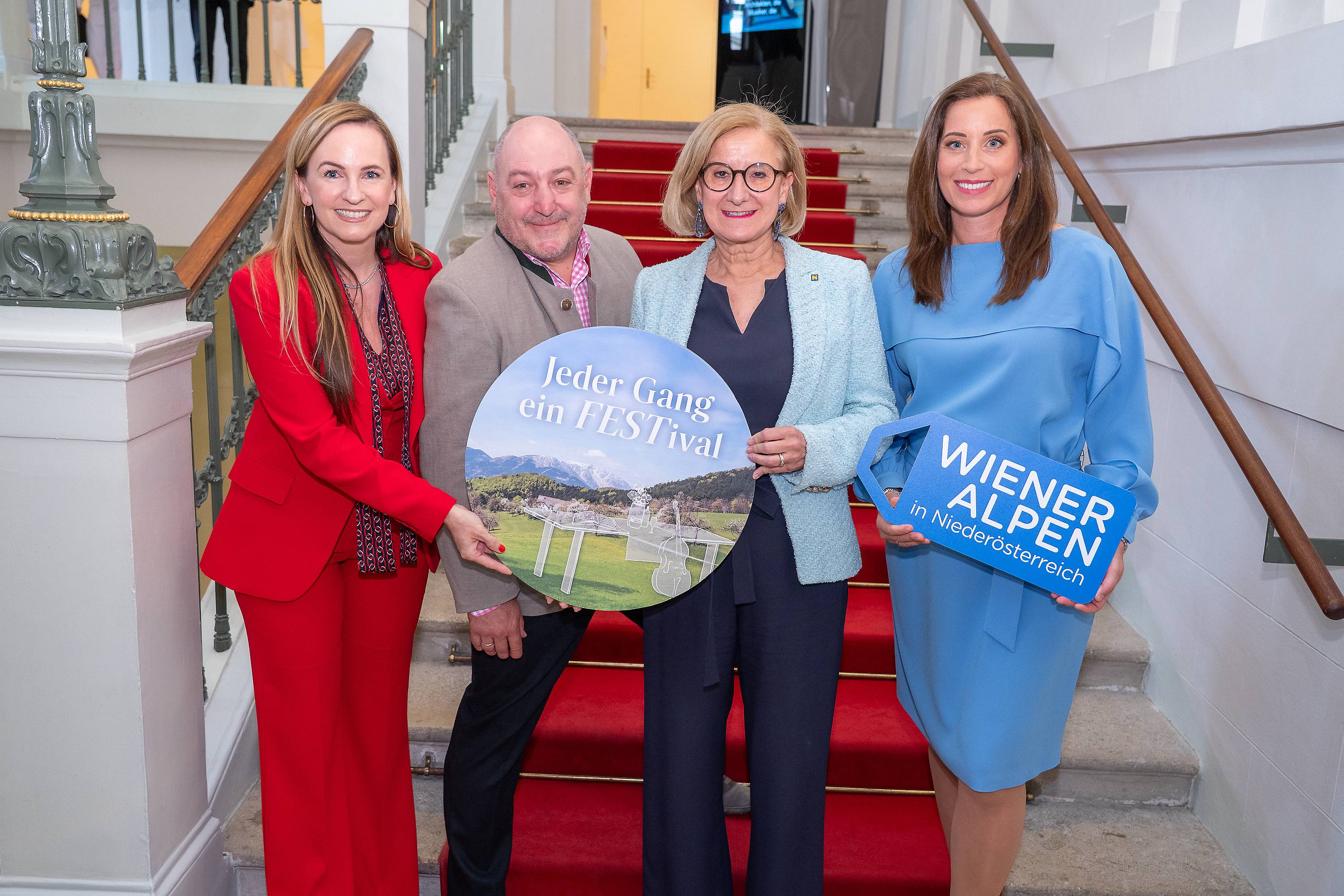 Pressebild 2: v.l.n.r. Maria Großbauer, Rudi Roubinek, Landeshauptfrau Johanna Mikl-Leitner, Wiener Alpen Geschäftsführerin Mariella Klement-Kapeller