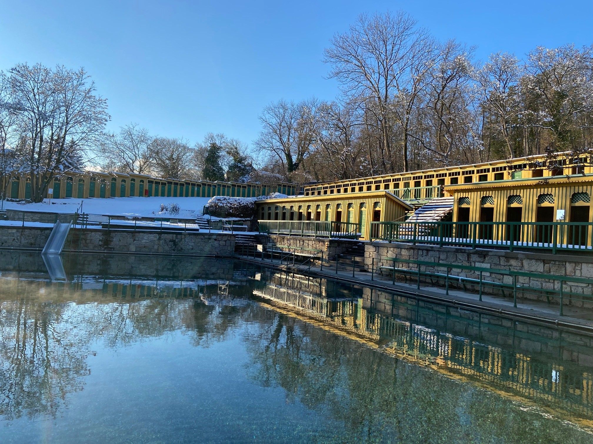 Umrahmt von Saisonkabinen in den k.u.k.-Farben Grün und Gelb liegt das Fischauer Thermalbad inmitten einer historischen Parkanlage: Zwischen alten Kastanienbäumen und romantischen Liegewiesen befinden sich neben einem efeubewachsenen Wasserfall zwei Naturbecken und ein modernes Kinderbecken.