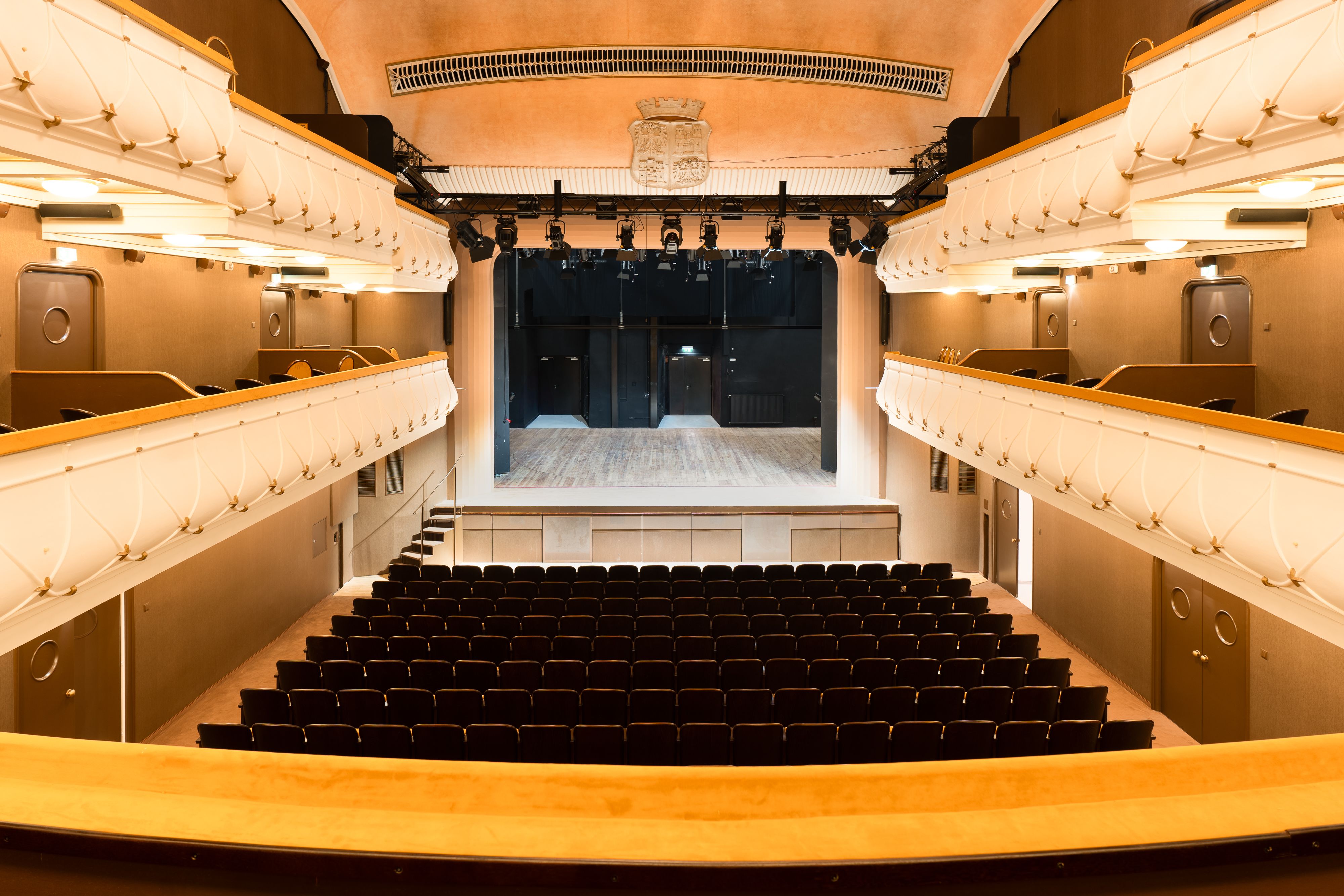 Das Theater besteht aus den Bereichen Parterre, 1. und 2. Rang mit klassischer Theaterbestuhlung.