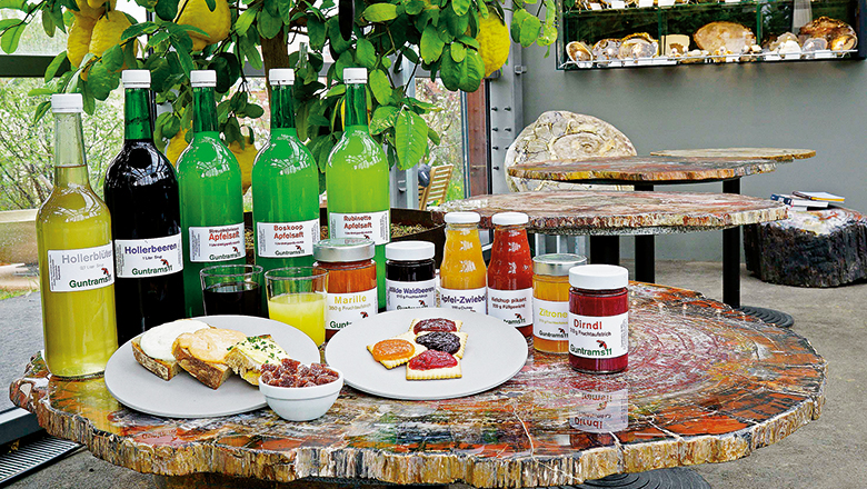 Versteckt in einem Backsteinbau hinter der Guntramser Ortstkapelle befindet sich die Edelmacherei. Hier werden die besten Produkte von Gut Guntrams und aus der Region schonend verarbeitet und abgefüllt. Die Produkte der Edelmacherei sind im Hofladen der Veranda erhältlich. Auf Wunsch werden gerne Führungen durch den kleine Betrieb veranstaltet, im Herbst kann man beim Saftpressen mit dabei sein.
