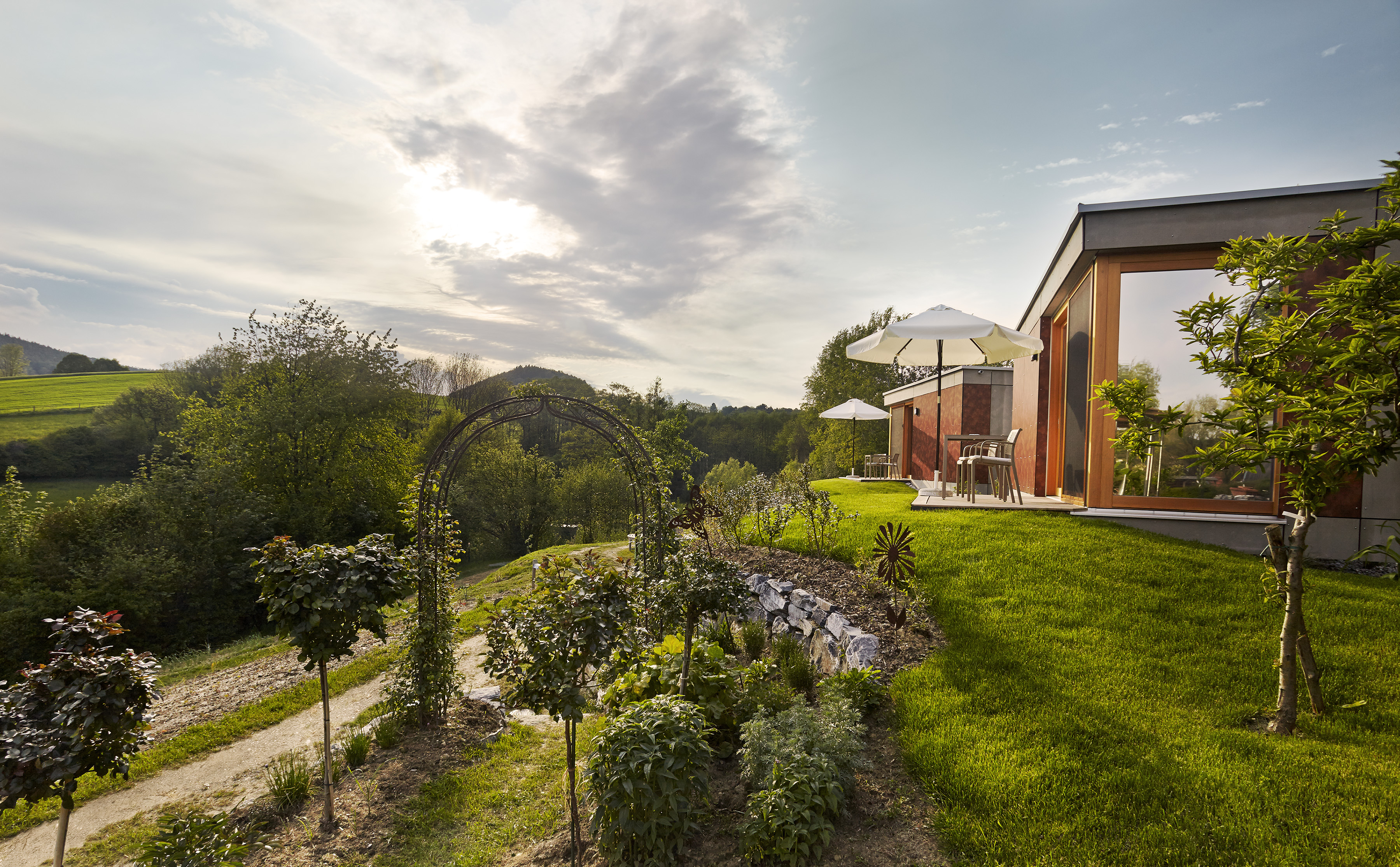 Alle Zimmer liegen nur wenige Schritte vom Lokal entfernt. 18–26 m² plus eigene Terrasse mit Sitzgelegenheit und Blick in die freie Natur. Doppelbett, gemütlicher Innensitzbereich, Sat-TV, Badezimmer mit Dusche, extra WC. Der Weg durch den TriadGarten führt Sie zu unserem idyllischen Teich. Dieser bietet Orte zum Verweilen, ist aber kein Badeteich.