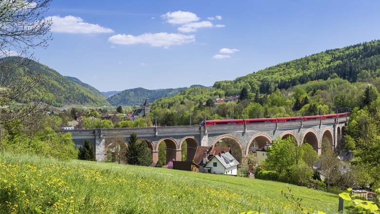 Die Kernstrecke von Gloggnitz nach Mürzzuschlag führt durch 15 Tunnels, über 16 Viadukte und 100 gewölbte Brücken und überwindet dabei 459 Höhenmeter. Vom „20-Schilling-Blick“ am Bahnwanderweg kann man das beeindruckende Viadukt „Kalte Rinne“ sehen. Nur wenige Meter weiter befindet sich die Doppelreiterwarte mit besonderer Perspektive auf die Semmeringbahn. Wer mehr über das UNESCO-Welterbe erfahren möchte, kann das Informationszentrum Semmeringbahn beim Bahnhof Semmering besuchen. Zum Wandern am Semmering eignet sich die stilechte Anreise mit der Eisenbahn besonders gut.