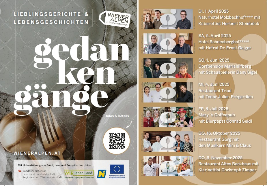 Die "Gedanken-Gänge" sind eine Eventserie, bei der Gastgeber:innen prominente Persönlichkeiten in ihr Lokal einladen. Gemeinsam teilen sie mit den Gästen Anekdoten und Erfahrungen in besonderer Atmosphäre, begleitet von einem exklusiven Menü mit regionalen Spezialitäten. Um dieses Leitprodukt zu bewerben, wird eine umfassende Marketingkampagne im Online- und Offline-Bereich durchgeführt, die mit der Ferienmesse Wien im Januar 2025 gestartet hat.