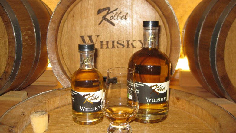 Am Bergbauernhof von Familie Kölbel reift im Kellergewölbe in aller Ruhe der eigens gebrannte Whisky. Seine fruchtige Note bekommt er durch die Eichenfässer, die durch die Lagerung des Kraxados aromatisiert werden. Kraxados ist ein aromatischer Apfelbrand – die Spezialität der Kölbels.