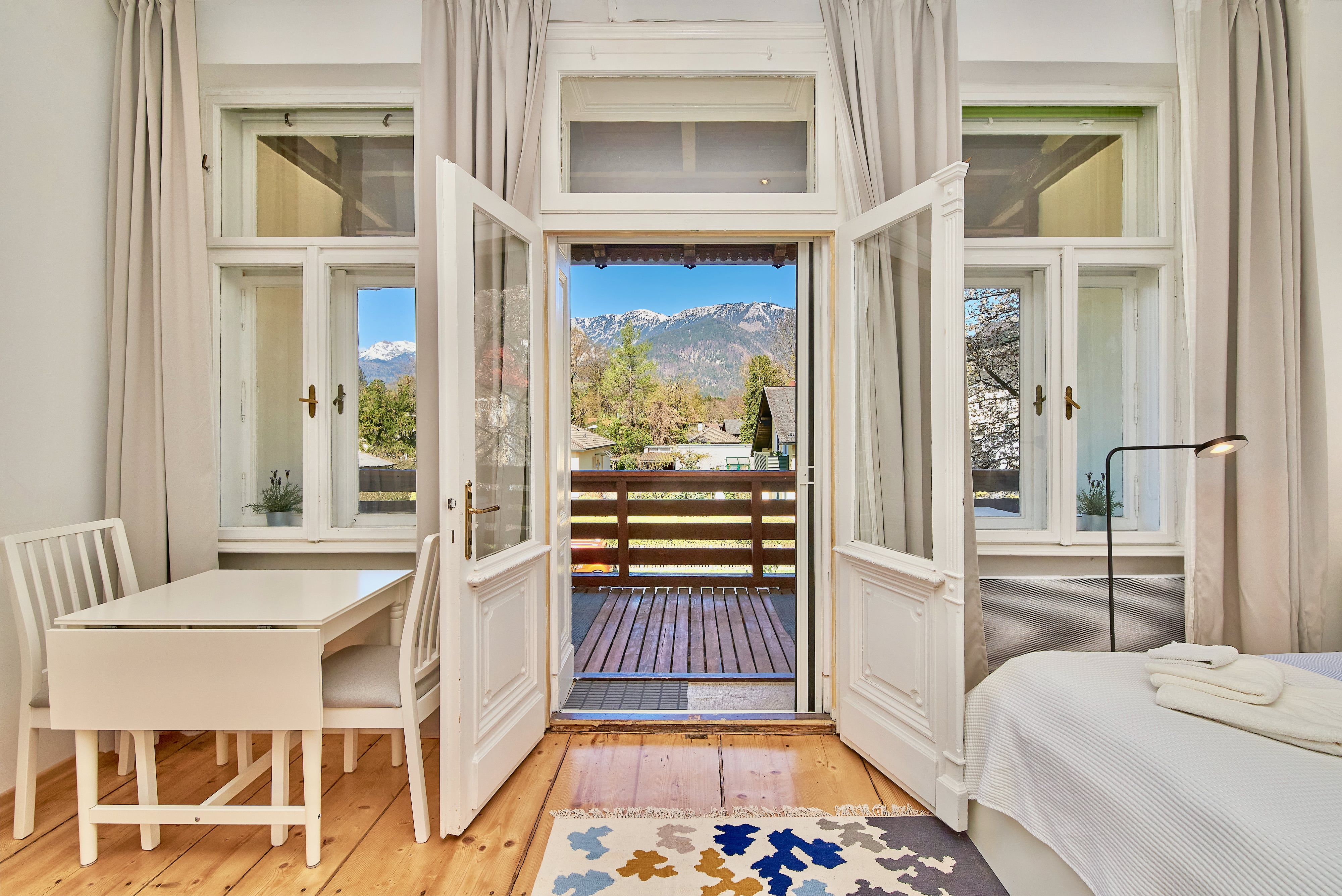 A cozy and dignified country house style runs through all apartments, with furniture from 3 centuries. All apartments are not only free of carpeting, most of them have 120-year-old floorboards. In addition, all the comforts of today: cozy bathtubs for two (not in all apartments), underfloor heating in the bathroom, free Wi-Fi throughout, ultra-flat screens with satellite connection (many of them digital and therefore streaming-capable), DVD players and a selection of DVDs, etc. Pellet stoves in every apartment provide cozy warmth and firelight at the touch of a button, even when it gets a little chilly beyond winter.