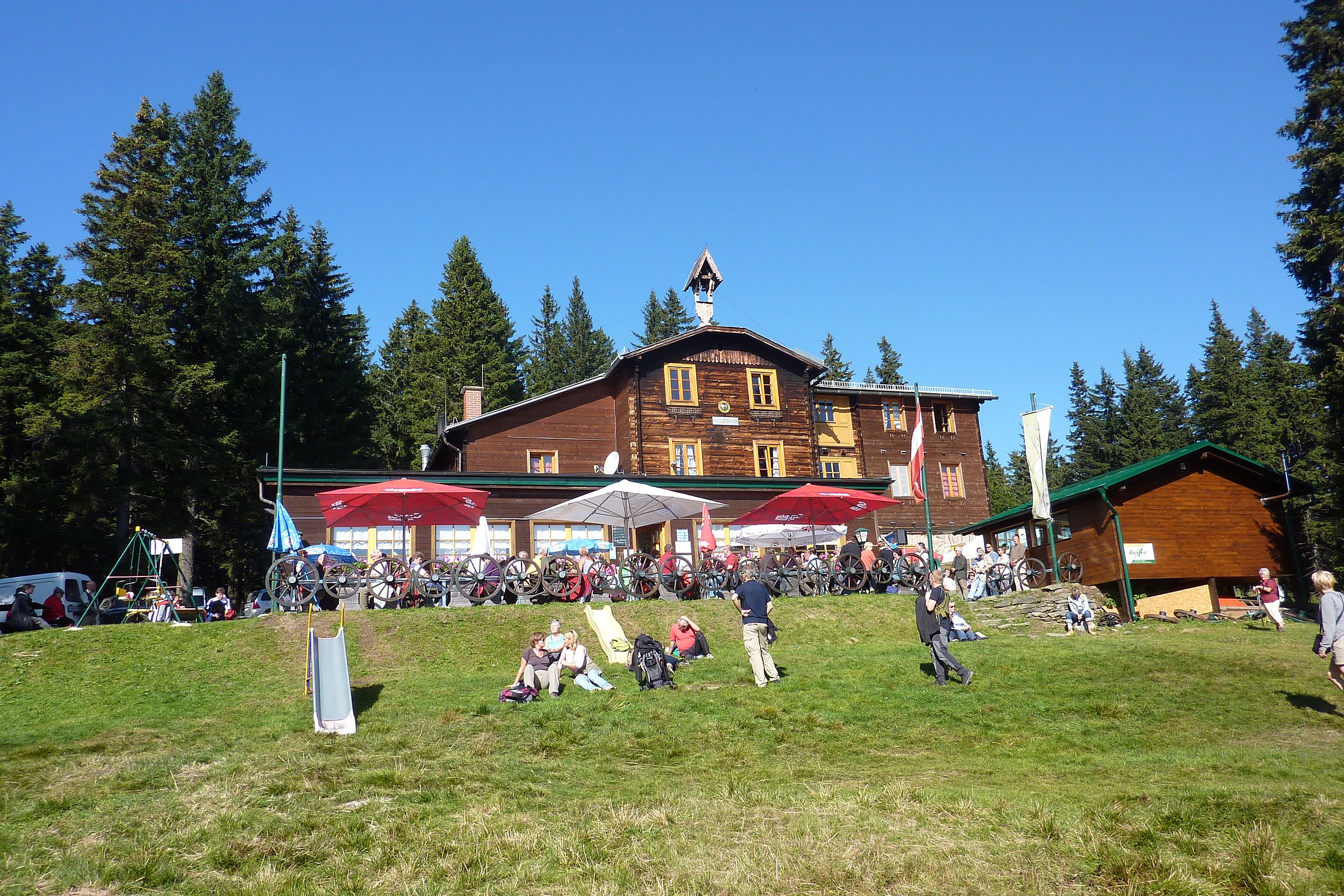 Das Hallerhaus am Wechsel ist eine dieser Hütten, die man sofort ins Herz schließt. Es befindet sich ca. 30 Gehminuten von der Bergstation Mönichkirchen entfernt und ist bei Wanderern und Skifahrern gleichermaßen beliebt. Auf ca. 1.400 Metern gelegen, eingebettet in die weiten Schwaigen des Wechselgebirges, ist es ein Ort zum Durchatmen – mit einem Ausblick, der weit über die Gipfel der Wiener Alpen reicht.