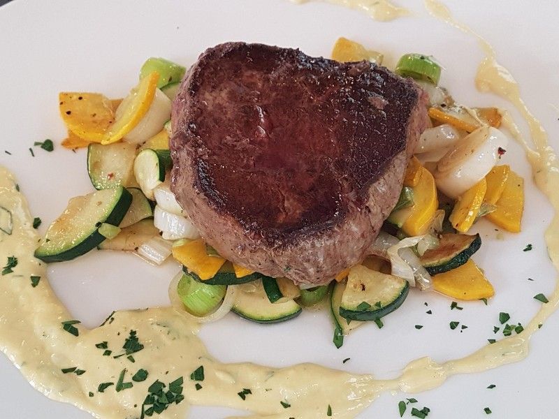 Die Speisekarte bietet saisonal wechselnde Spezialitäten mit frischen, sorgfältig ausgewählten Zutaten sowie besondere Genussmomente von klassischen Grill‑ und Fleischgerichten bis zu delikaten Fisch‑Variationen.