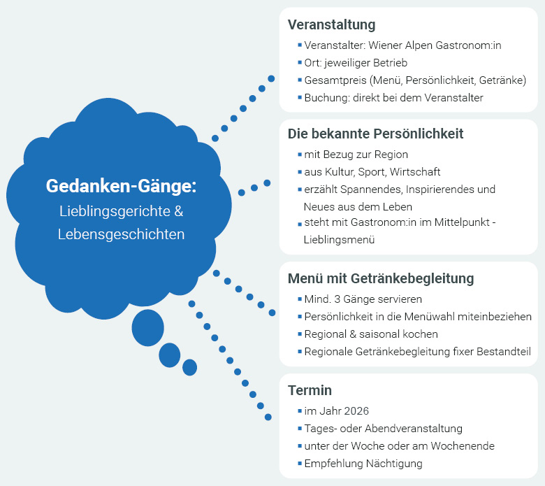 Bei Gedanken-Gänge, dem exklusiven Tages- oder Abendevent, stehen ein/e Wiener Alpen Gastronom:in sowie eine bekannte Persönlichkeit aus Kultur, Sport, Wirtschaft etc. im Mittelpunkt. Im intimen Rahmen erfahren unsere Gäste Spannendes, Inspirierendes und Neues aus dem Leben der Gastgeber:innen sowie der Persönlichkeit und kosten sich dabei durch dessen Lieblingsmenü. Serviert werden regionale Produkte aus den Wiener Alpen mit ganz persönlicher Note.