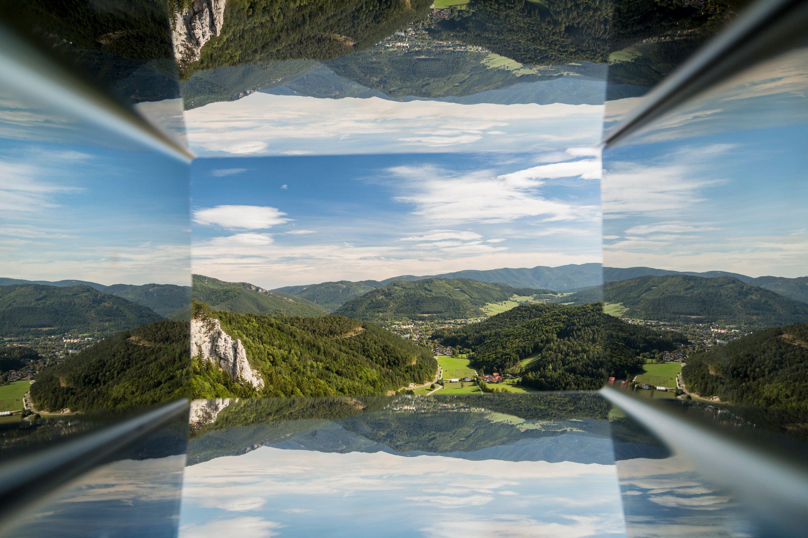 Standort/Aussicht: Vom Gipfel des Haussteins auf 664 Höhenmetern blick man auf die Ortschaft Muggendorf und die umliegende Berglandschaft mit freier Sicht bis zu den Nordabstürzen des Schneebergs.