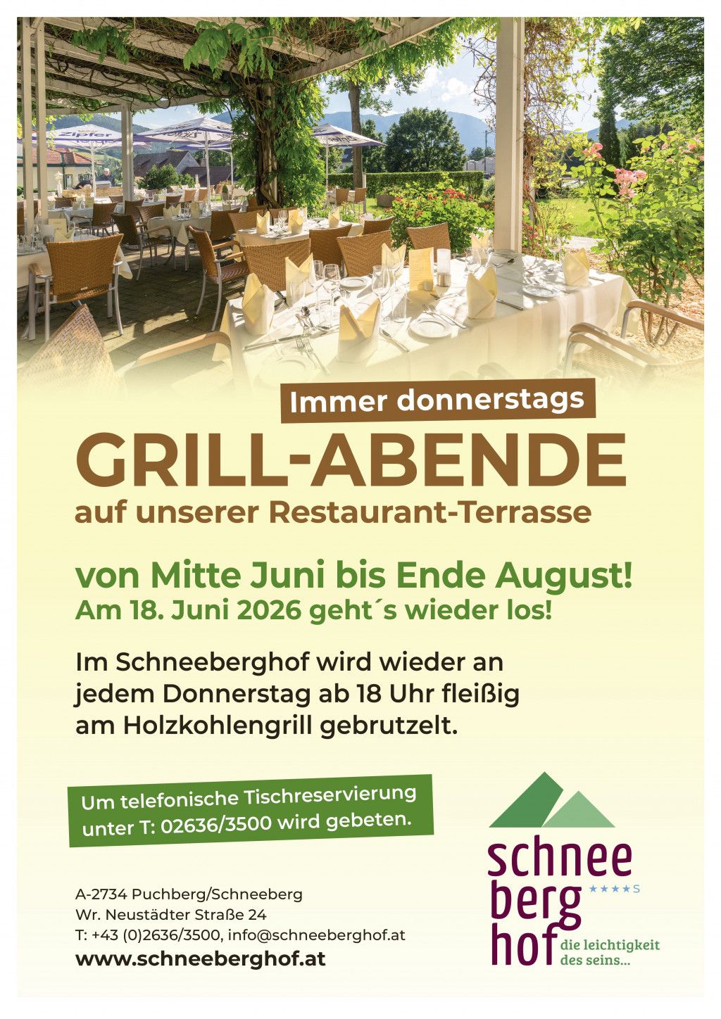 Am 18. Juni 2026 geht´s wieder los! Im Schneeberghof wird wieder an jedem Donnerstag fleißig am Holzkohlengrill gebrutzelt.