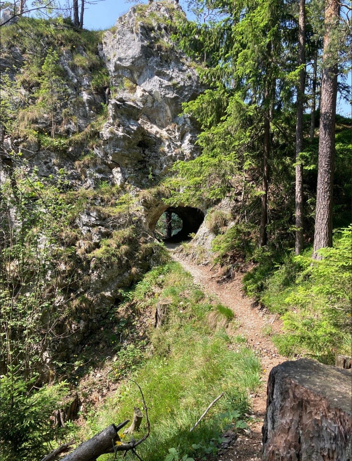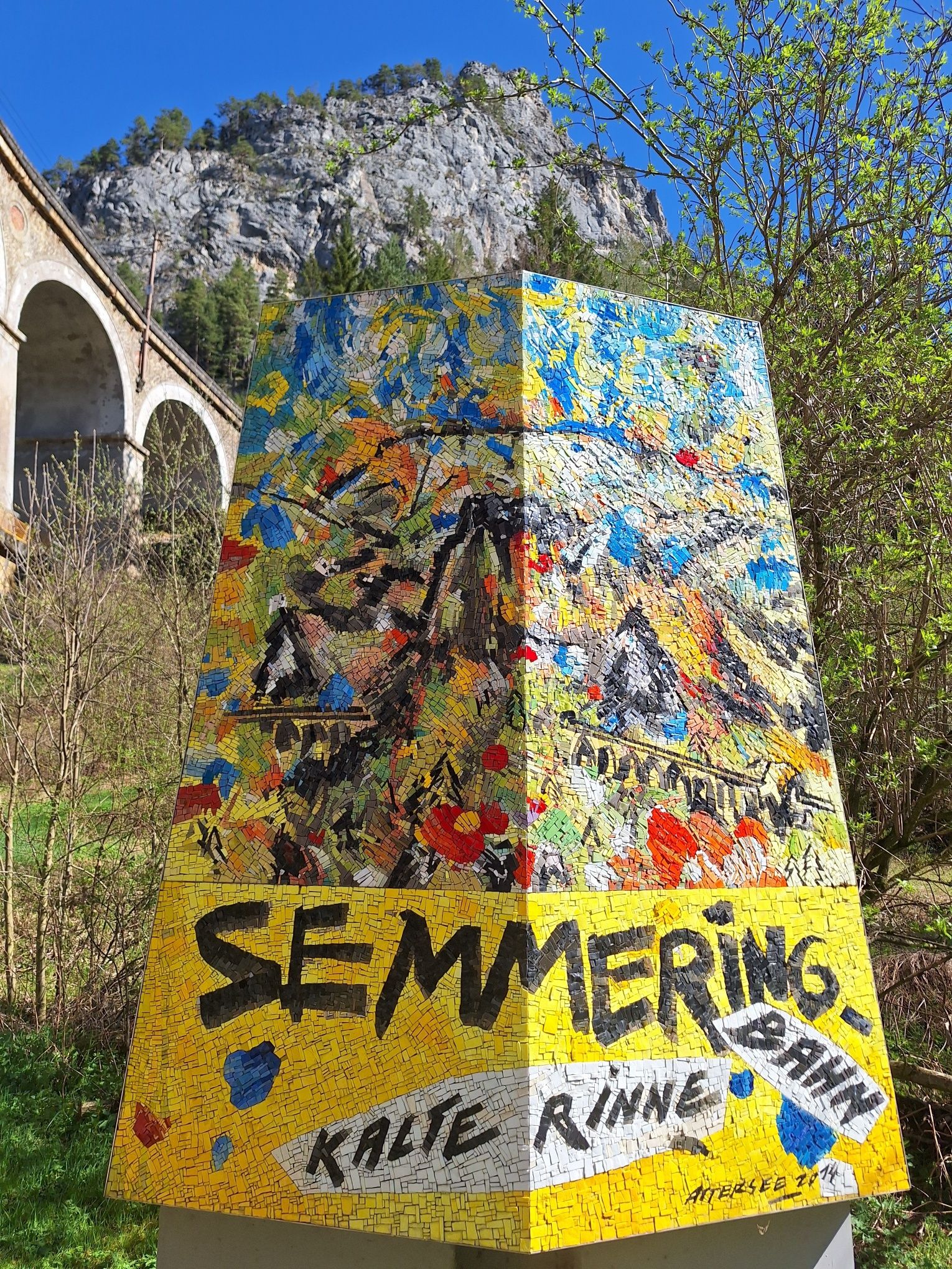 Ein besonderes Highlight beim Abstieg ist ein natürlich entstandenes, pittoreskes Felsenfenster. Der Weg führt weiter bergab zum Kalte Rinne Viadukt, wo sich ein kunstvolles Mosaik des bekannten Künstlers Christian Ludwig Attersee befindet. Ein weiteres Mosaik ist auf der Kalte-Rinne Straße zu entdecken.