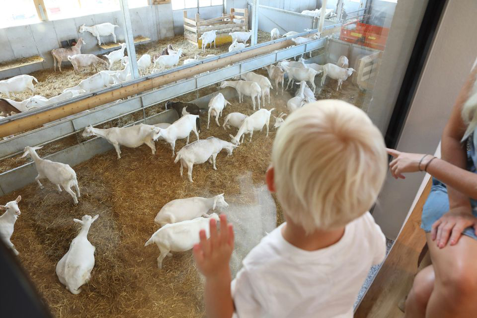 Im Hofladen können auch ganz entspannt die Ziegen durch zwei große Fenster, dem „Goaß-Kino“, beobachtet werden.