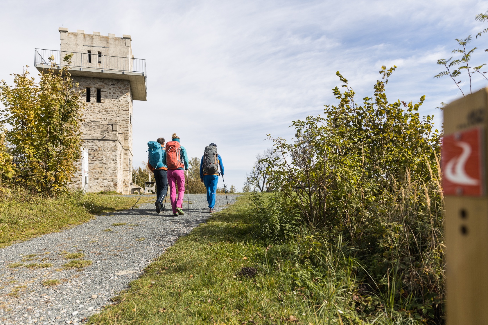 Ab der Passhöhe an der Bundesstraße geleitet Sie der Steinlehrpfad auf den Gipfel des Geschriebensteins (884 hm) mit seiner Aussichtswarte. Er bildet gleichzeitig die Grenze zwischen Österreich und Ungarn. Mit einem gültigen Reisepass oder Personalausweis können Sie hier die Grenze ungehindert überschreiten. Vom Geschriebenstein (Irottkö) wandert man bergab zur Hörmann-forrás (Hörmann-Quelle) und in weiterer Folge zu den Steirerhäusern. Von hier geht es weiter über Waldwege und kommt nach einem letzten, kurzen Anstieg auf die Ruine Óház-tető mit ihrem Aussichtsturm. Nun ist es nicht mehr weit in die wunderschöne Stadt Kőszeg, wo der alpannonia® - Hauptweg vorbei am Naturschutzzentrum bis in das Stadtzentrum führt. Hier erreicht man das östliche Ende/ Beginn des alpannonia® -Weges.enlandes bis nach Ungarn