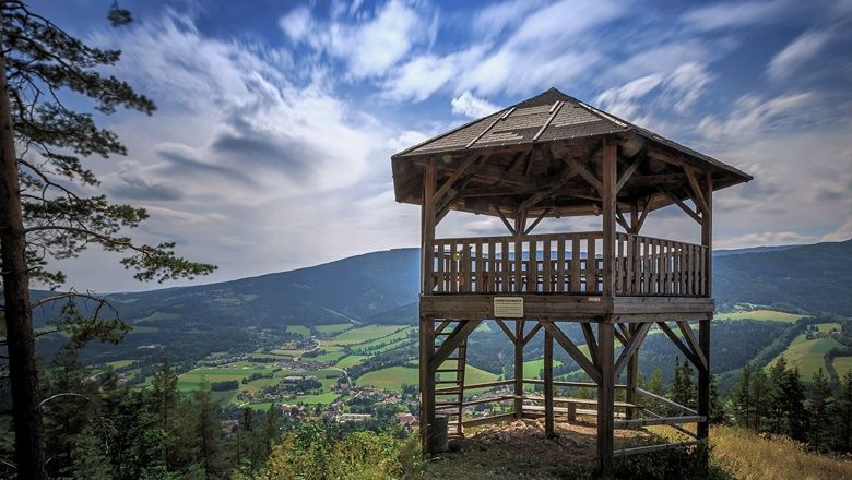 Der Weg führt vom Hotel Molzbachhof über das Ebenfeld zur Wolfgangskirche. Über den Kirchgrabenweg geht es weiter zur Kernstockwarte, wo wir mit einem herrlichen Ausblick auf das Wechselgebiet, Stuhleck, Rax und Schneeberg belohnt werden.