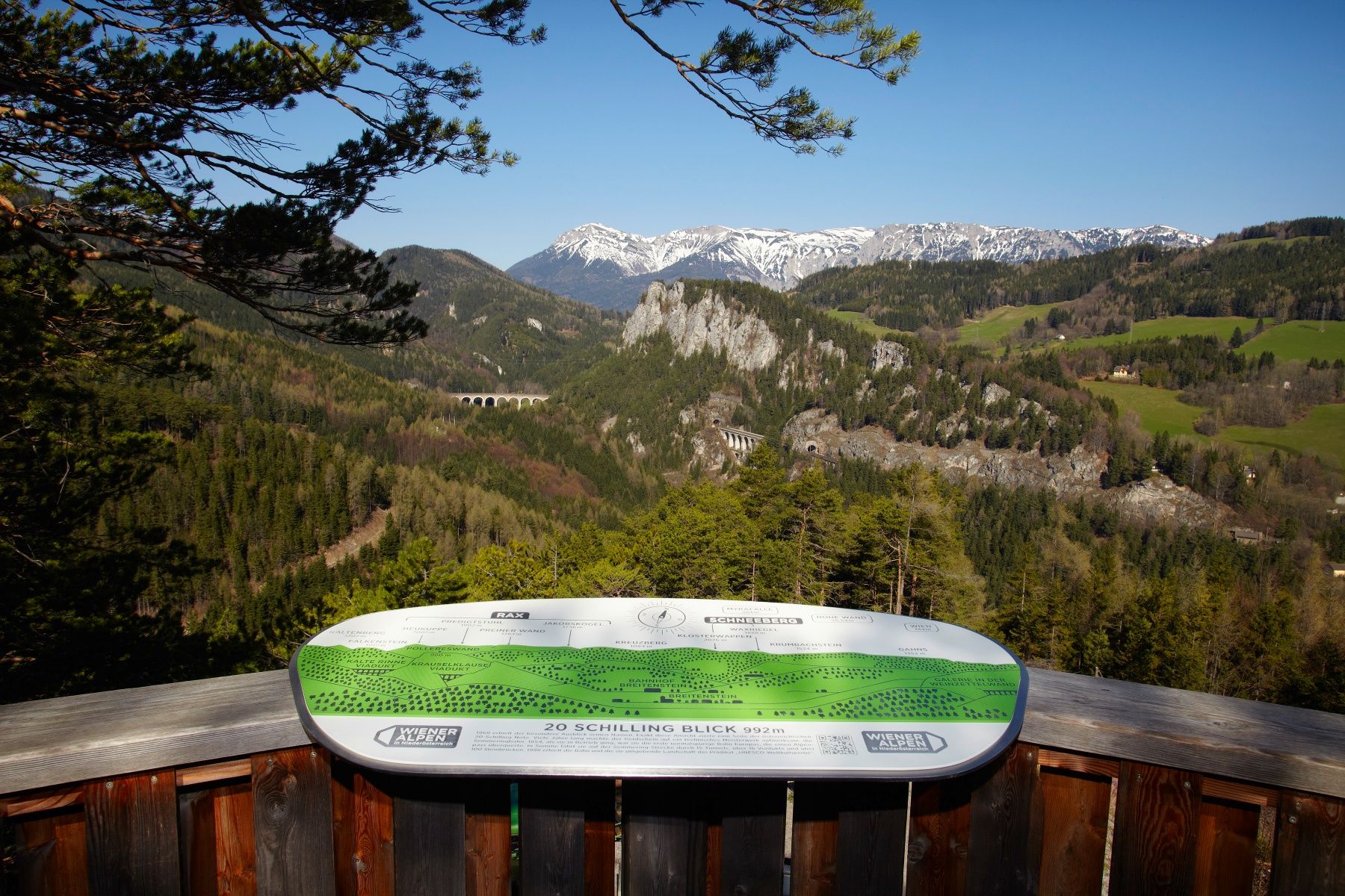 Gleich dem großen Alpenbogen reihen sich die vielfältigen Landschaften der Wiener Alpen aneinander. Ein „kleiner Alpenbogen“ mit grandiosen Ausblicken fächert sich auf: Die sanften Hügel der Buckligen Welt, die Almenlandschaft am Wechsel – auch Schwaigen genannt –, der Semmering – weltberühmt durch die Semmeringbahn, die den Titel UNESCOWeltkulturerbe trägt –, die alpinen 2000er Schneeberg und Rax sowie die sanften Erhebungen der Gutensteiner Alpen.
