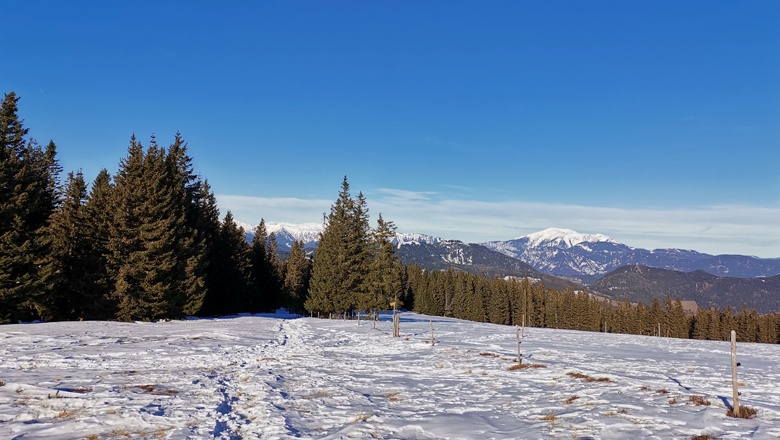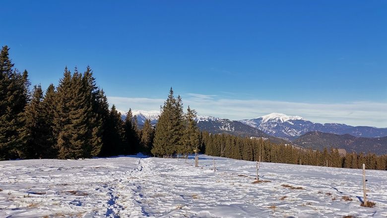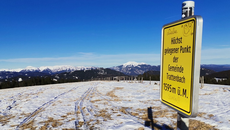 Der Weg schlängelt sich weiter den Berg hinauf, immer am Zaun entlang. Oben angekommen eröffnet sich ein traumhafter Panoramablick auf die umliegenden Hügel und Gipfel. Der schneebedeckte Arabichl glitzert im Sonnenlicht, und die klare Luft lässt die Konturen der fernen Bergspitzen von Rax und Schneeberg scharf erscheinen. Die Bänke laden dazu ein, einen Moment innezuhalten und die Ruhe der Winterlandschaft zu genießen.