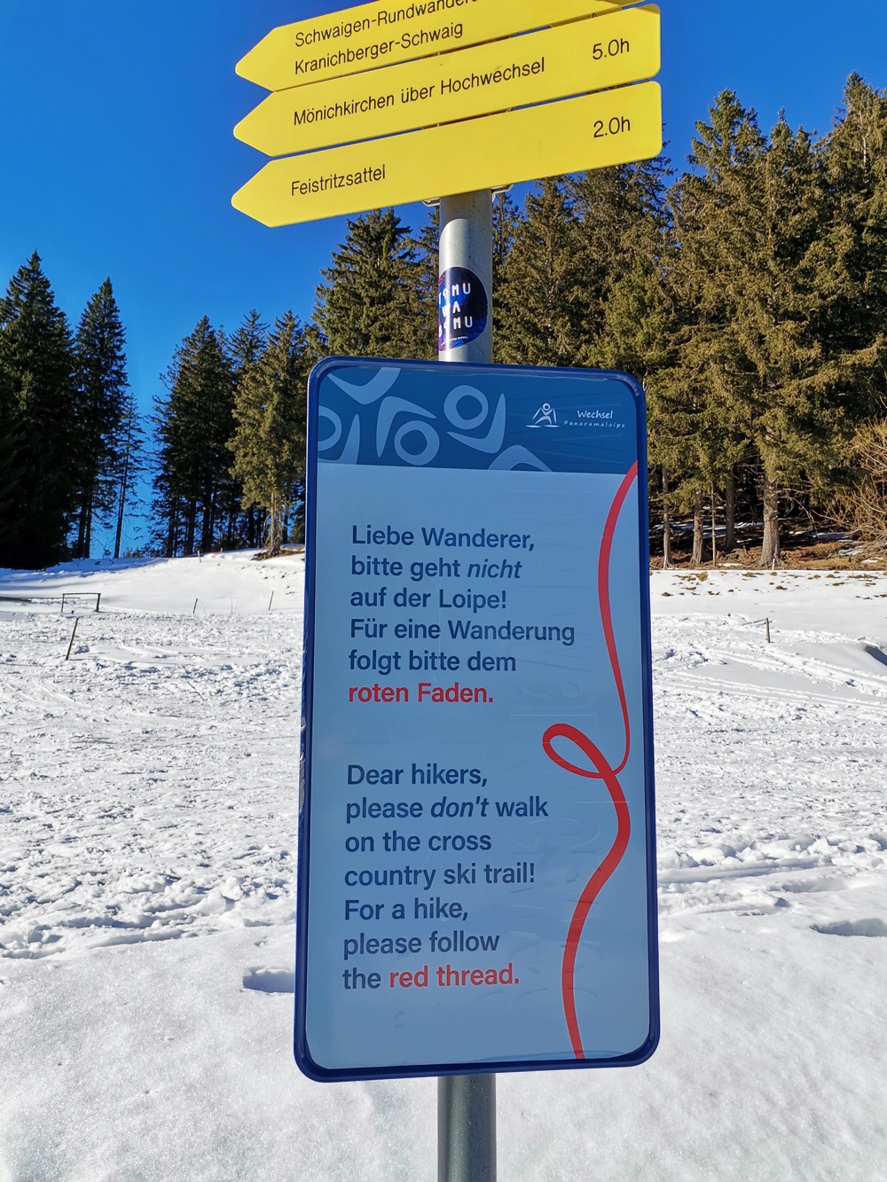 Für den Rückweg geht man den gleichen Weg wieder retour. Auch empfehlenswert ist es noch bis zum Dreiländereck zu spazieren. Der Weg ist markiert , vor der Kuppe auf den Arabichl rechts bzw. beim hintergehen links. Der Weg ist meist gut ausgetreten. Sonntags trifft man dort vielleicht das Loipenkaffee am Ski-doo an. Und nach einer Stärkung mit Kaffee, Tee oder Schnapserl und einer kurzen Rast auf den Liegestühlen geht es dann wieder zurück auf die Schwaig.