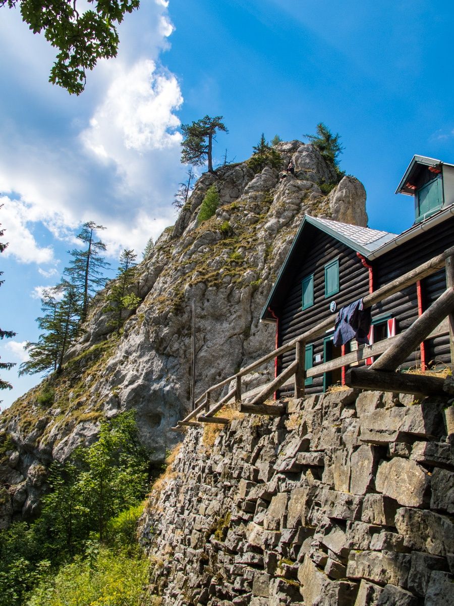 Vom Weichtalhaus im Höllental erreicht man die Kienthaler Hütte entweder über den Klettersteig durch die Weichtalklamm - hier ist unbedingt Trittsicherheit erforderlich! Der angenehmere Weg verläuft über den Ferdinand Mayr Weg und ist auch für Familien geeignet. Aufgrund der Gehzeit von über 2 Stunden sollte man aber auch Pausen einplanen. Die Kienthaler Hütte liegt auf 1380 Höhenmetern am südwestlichen Schneeberg. Das urige Holzblockhaus befindet sich in malerischer Lage am Fuß des Turmsteins. Über Klettersteige erreicht man in kurzer Zeit den Turmstein-Gipfel auf 1416 Metern Seehöhe, wo man atemberaubende Ausblicke ins Große Höllental, auf die Rax, Schneealpe, die Mürzsteger und Türnitzer Alpen genießt. Die Kienthaler Hütte wird vom Verein „Alpine Gesellschaft Kienthaler“ bewirtschaftet und bietet Schlafplätze sowie einfache Verflegung mit Brot und Suppen an. Damit ist sie der optimale Zwischenstopp für eine Wanderung auf den Schneeberggipfel, den man von hier in ein bis zwei Stunden erreicht.