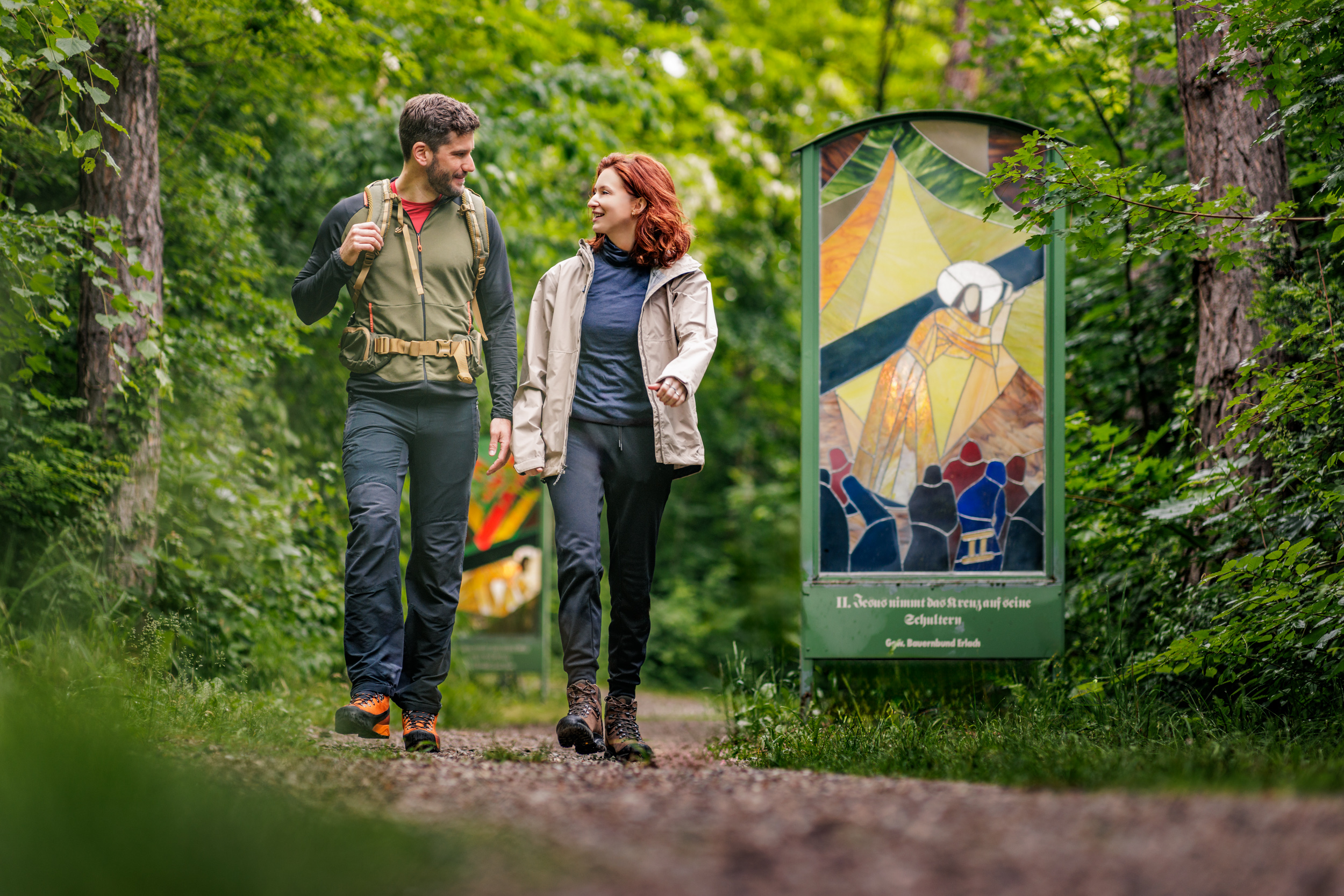 Mit 14 leuchtenden Tiffany-Glaskunstwerken markiert der Gläserne Kreuzweg den Pfad zur Ulrichskirche. Er liegt auf einem Hügel bei Bad Erlach und gilt als Kraftpunkt für innere Ruhe und mentale Stärke.