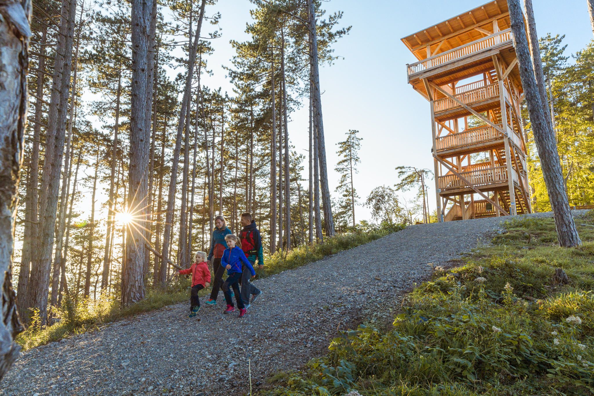 Der Rosalia Rundwanderweg lässt sich individuell gestalten und ist für Anfänger:innen geeignet – optimale Voraussetzungen für einen Familien-Wanderurlaub, zum Beispiel in den Herbstferien im Oktober: In bunte Blätterhaufen springen, den hölzernen Aussichtsturm in Lanzenkirchen erklimmen oder auf den geheimnisvollen Spuren der Leitha-Hexen wandeln – und abends müde aber glücklich ins Bett sinken.